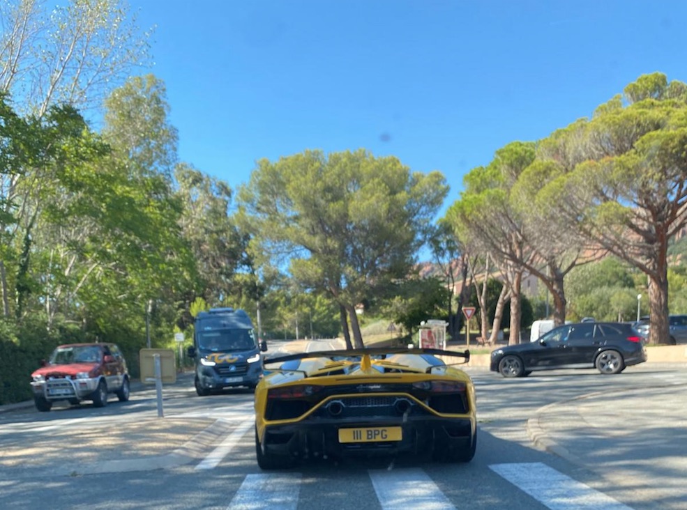 pendant ce temps le prez' et les fayots qui l'ont suivi sont coincés dans les embouteillages, heureusement une Lamborghini pointe son nez, son cul plutôt, et permettra au prez' de prendre son mal en patience