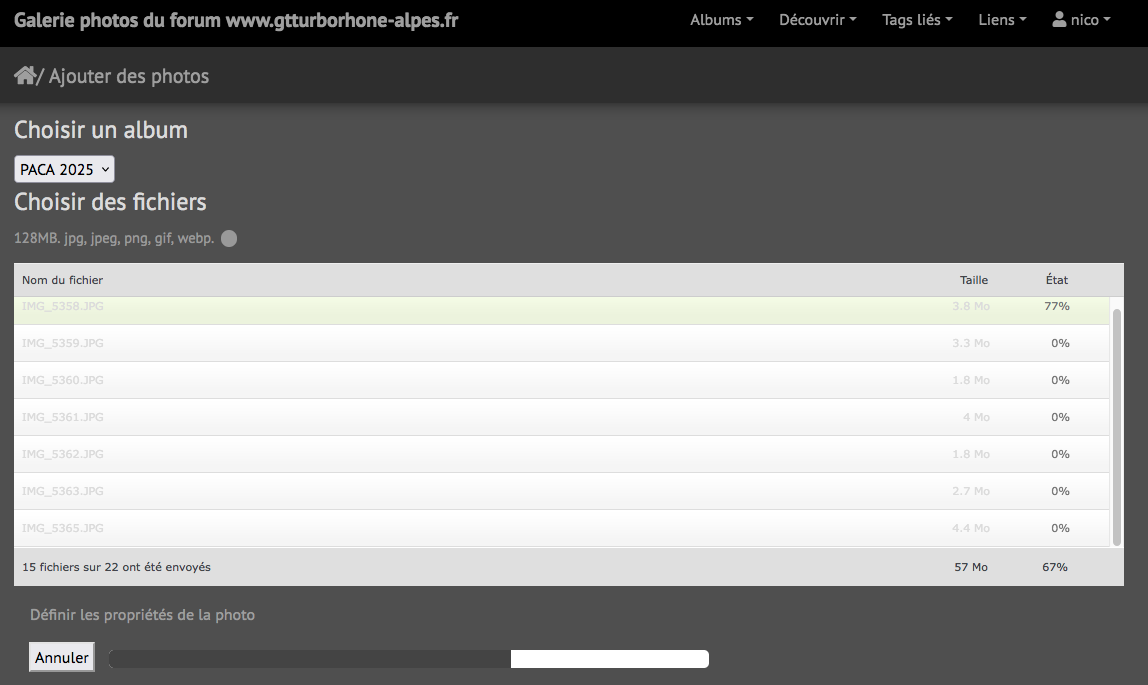 , essaye avec deux ou 3 photos à chaque fois, plutôt que tout en même temps. Mathieu a fait une dizaine d'envois avec 10 photos à chaque fois et ça été nickel