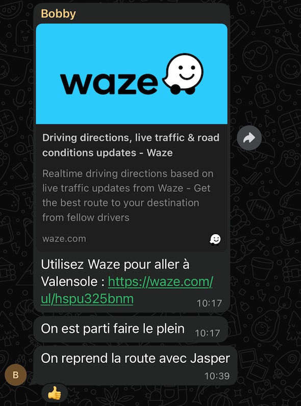 on se sépare et sur le whatsapp de la PACA les nouvelles de chacun tombent au fur et à mesure que les GT retrouvent leur garage, et on comprend mieux pourquoi rémi était content de nous quitter : il a enfin pu résoudre ses problèmes de constipation après 3 jours sans faire caca, ça inspire le respect à tout le groupe :respect: