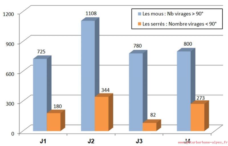 - J2 et J4 sont très virageux avec plus de mille virages à chaque fois. Curieusement on pourrait penser que J4 avec son parcours alpin serait largement devant J2.